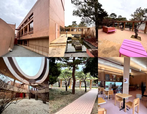 외벽 전체가 핑크빛 콘크리트로 마감된 이 건물은 곡선과 직선을 활용한 독특한 구조로 구성되어 있습니다. 마치 미술관에 들어선 듯한 고요한 분위기를 풍기며, 건물 자체가 예술 작품처럼 느껴지는 곳입니다. 정원은 자연석과 마른 식물, 얕은 수로로 구성되어 있으며, 산책하듯 둘러볼 수 있는 코스가 마련돼 있어 사진 촬영 장소로도 인기가 많습니다. 사계절의 변화를 담은 이 풍경은 계절마다 새로운 감성을 선사합니다.