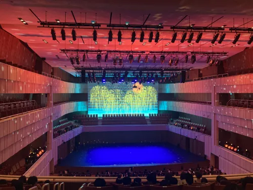 그랜드홀의 음향은 발레 음악을 섬세하게 전달해 주었고, 조명은 장면마다 분위기를 극적으로 변화시켰습니다. 빨강·보라·파랑 조명이 교차하며 발레리나들의 의상을 더욱 돋보이게 했습니다. 특히 무대 뒤편 스크린의 빛과 천장 무빙라이트가 연출한 장면들은 공연의 몰입도를 한층 높였습니다.