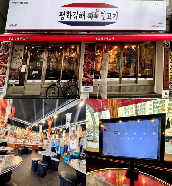 매장은 건물 1층에 위치하고 있어 접근성이 좋습니다. 간판에는 ‘평화김해뒷고기’라는 상호와 함께 돼지 일러스트가 큼직하게 그려져 있어 쉽게 눈에 띕니다. 유리로 된 입구에는 영업시간과 메뉴 안내문이 붙어 있고, 창문을 통해 내부가 훤히 들여다보이는 구조라 처음 방문하는 손님도 부담 없이 들어갈 수 있죠. 외부는 깔끔하고 밝은 톤으로 꾸며져 있으며, 좌측에는 메뉴판 이미지도 크게 부착되어 있어 어떤 메뉴를 판매하는지 한눈에 확인할 수 있습니다. 전반적으로 체인점답게 통일된 브랜딩과 전문성이 느껴졌습니다.