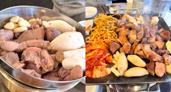 메뉴 주문 시 스테인리스 볼에 마늘, 새송이버섯과 함께 뒷고기가 푸짐하게 담겨 나옵니다. 고기의 상태는 신선하고 육즙 가득한 느낌이었으며, 무엇보다 직원분이 직접 철판에서 구워주는 시스템이라 익힘 걱정 없이 편하게 먹을 수 있다는 점이 인상 깊었습니다.