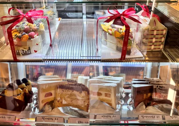 케이크 하나하나 모두 포장 상태가 깔끔하고 위생적으로 개별 비닐포장 처리되어 있으며, 그 위에는 계절 과일과 먹을 수 있는 꽃잎 장식이 올려져 있어 보는 순간 ‘선물용으로도 손색없겠다’는 생각이 들었습니다. 맛뿐 아니라 비주얼에서도 높은 만족도를 느낄 수 있는 곳입니다.