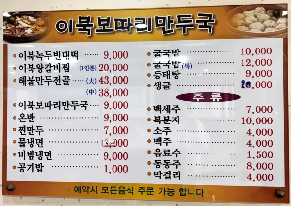 • 주요메뉴: 굴국밥, 이북보따리만두국, 이북녹두빈대떡, 찐만두, 동태탕, 이북왕갈비찜 등