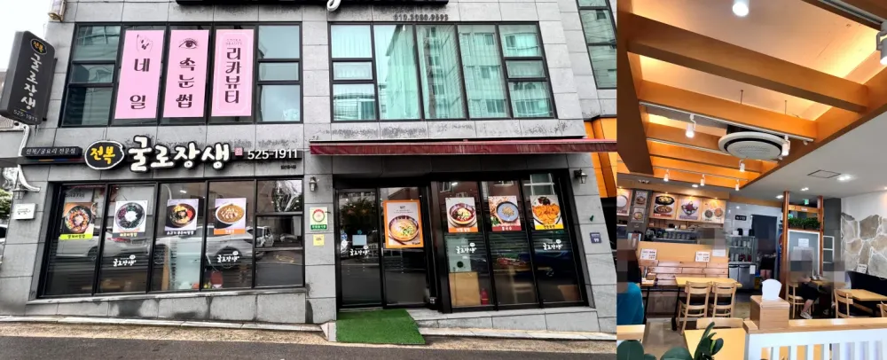 굴로장생은 평범한 상가 건물 1층에 자리하고 있지만 외부에는 큼직한 메뉴 사진들이 잘 정돈되어 있어 눈에 잘 띄는 구조입니다. ‘전복/굴요리 전문점’이라는 간판이 눈에 들어오고, 창문에는 대표메뉴들이 포스터로 부착돼 있어 입장 전 어떤 음식을 파는지 쉽게 파악할 수 있어요.