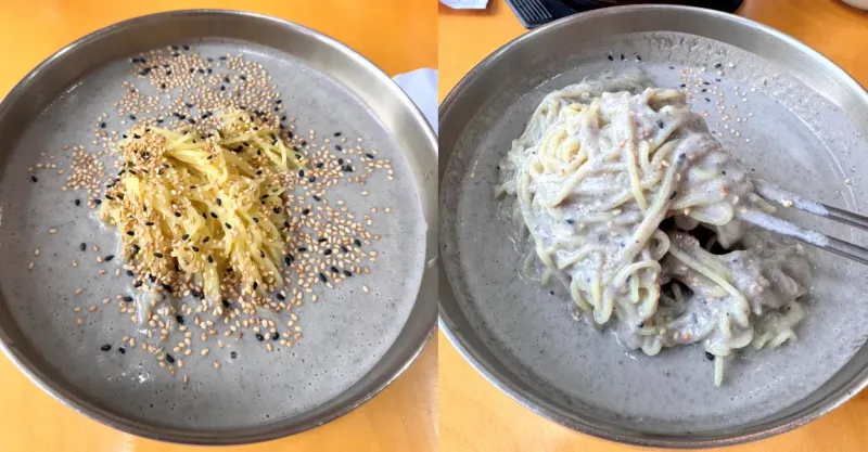 콩물을 떠보면 그 자체로 밀도가 느껴지고, 검은깨와 참깨가 가득 뿌려져 있어 비주얼부터 고소함이 폭발합니다. 면은 부드럽고 찰진 중면으로, 찬 콩국물과도 잘 어우러졌어요.