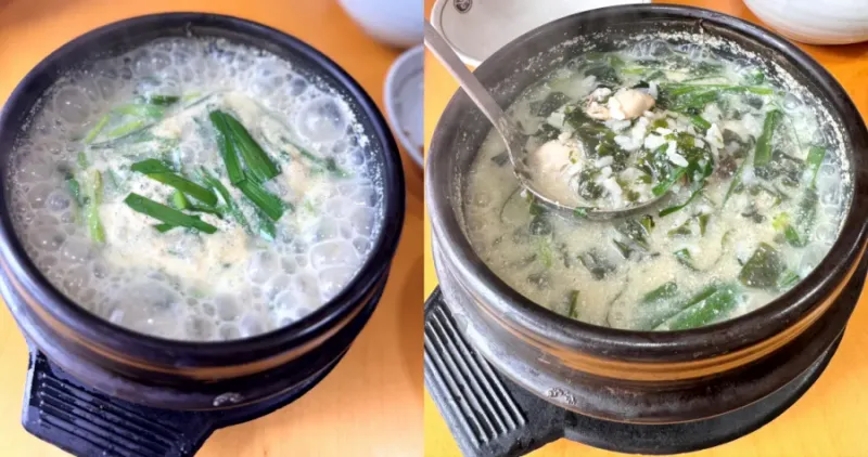 특히 굴의 양이 넉넉해서 숟가락을 뜰 때마다 굴이 푸짐하게 딸려오는데, 비린 맛 없이 깔끔하게 조리되어 있어 굴을 좋아하지 않는 분들도 부담 없이 즐길 수 있을 정도입니다. 들깨가루가 들어가서 고소함을 더하며, 국물은 부드럽고 따뜻해서 속을 달래주는 최고의 해장국 같은 느낌이에요.