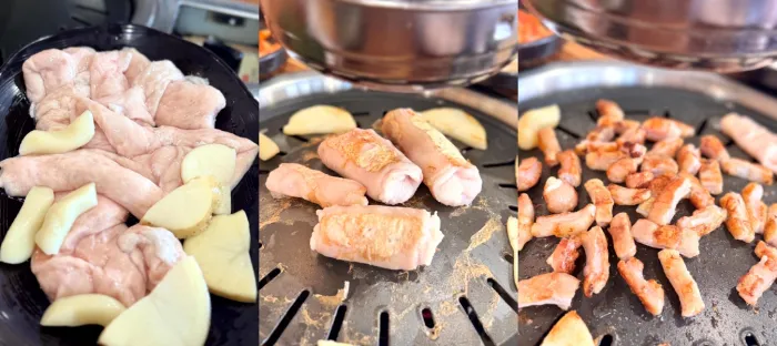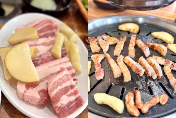 구워보면 불판에 닿자마자 기름이 자글자글 흘러나오고, 노릇노릇하게 익은 삼겹살은 고소하면서도 느끼하지 않은 맛이 일품이었다.