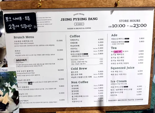- 브런치 : 크로와상 프렌치토스트(15,000원), 라자냐(15,000원), 정평 브런치 플레이트(18,000원) 등.