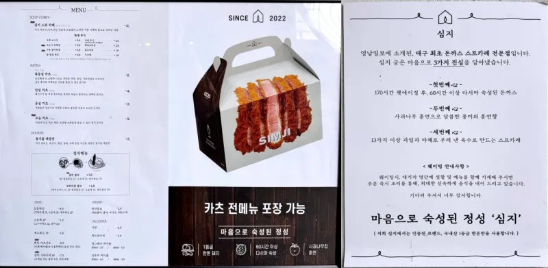 - 특징 : 대구 최초 돈카츠 스프카레 전문점, 전 메뉴 포장 가능, 숙성과 훈연을 강조한 조리법