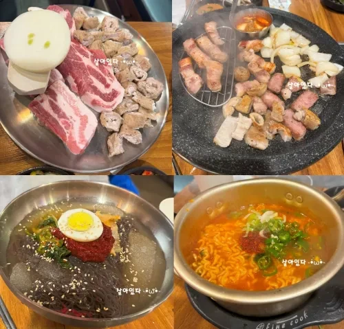 - 주문 메뉴: 모둠 세트 (삼겹살, 목살, 막창 포함) + 사이드 물냉면, 땡초냉면