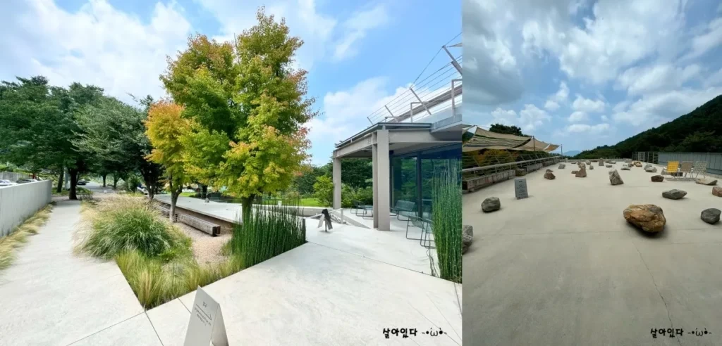 카페 내부는 2층 구조로 되어 있으며, 2층은 노키즈존으로 운영됩니다. 1층에는 일반 테이블 좌석과 신발을 벗고 앉는 좌식 테이블이 마련되어 있어, 어린이들과 함께 오면 편리합니다. 야외 테이블도 다양한 형태로 준비되어 있지만, 그늘막이 많지 않아 여름철에는 실내에서 식사하는 것이 좋습니다. 애완동물 동반은 불가능하니 참고하세요.