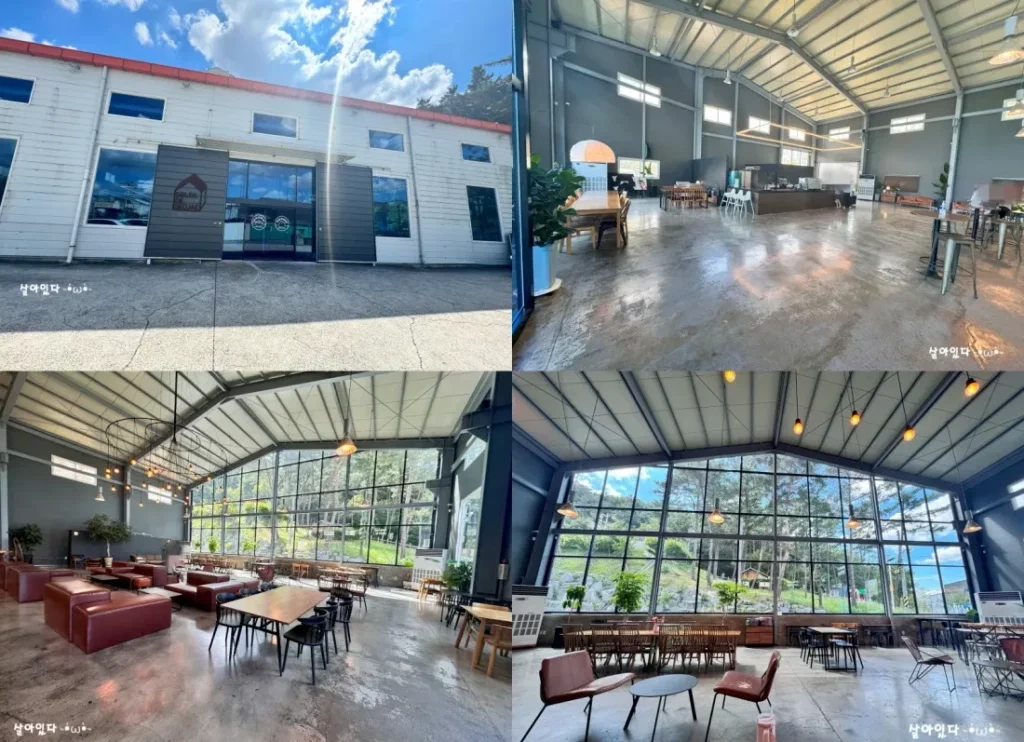 서재 지역에 위치한 솔레일드 카페는 단층으로 넓게 펼쳐져 있으며, 외관은 공장이나 창고를 연상시키는 독특한 매력을 지니고 있습니다. 카페 앞에 넓은 주차장이 마련되어 있어 차량 이용 시 주차 걱정이 없다는 점도 큰 장점입니다.