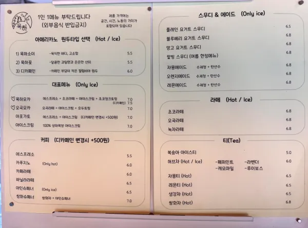 • 커피: 아메리카노(목하소이, 목하몽, 디카페인 원두 선택 가능), 바닐라라떼, 카푸치노, 아인슈페너 등