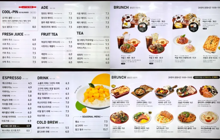 - 음료는 4,500원~7,500원대, 브런치 메뉴는 12,000원~19,000원 선입니다.