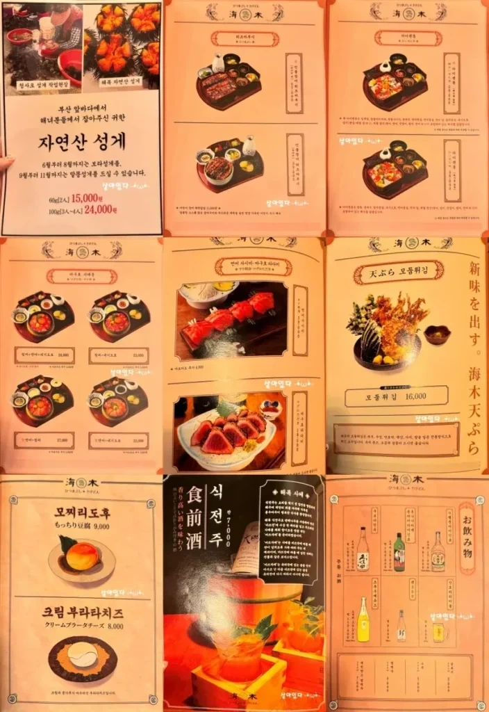 해목의 대표 메뉴는 다양한 덮밥과 사시미입니다. 저는 부산에서 맛봤던 장어덮밥과 카이센동 외에도, 먹어보지 못한 다양한 메뉴를 주문해 보았습니다. 특히 이번에는 특카이센동이 있어서 기대가 되더군요!