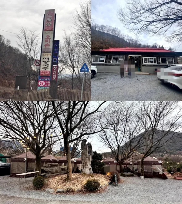 식당은 팔공산 입구 도로변에 위치해 있어 찾기 쉬우며, 도로변에 높이 세워진 입간판에 "원조할매 어탕국수", "부지갱이", "뚜레박 식당"이라는 명칭이 함께 적혀 있어 멀리서도 눈에 띕니다.