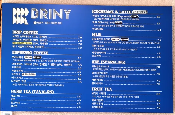 - 음료: 드립/에스프레소/밀크류 모두 6,500원~8,000원