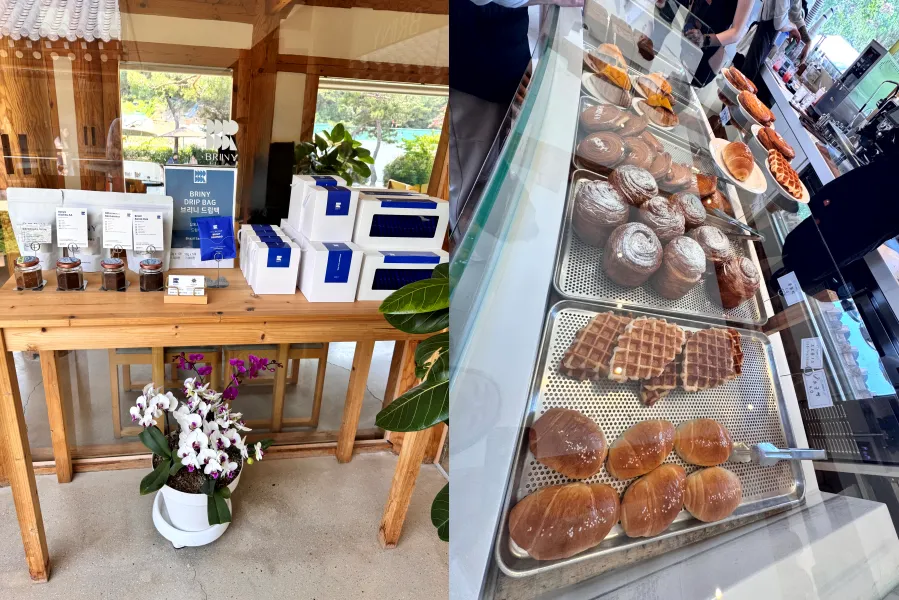 브리니 입구에서는 자체 브랜드 로스팅 원두로 구성된 드립백 세트를 판매하고 있습니다. 브라질 세라도, 에티오피아 예가체프 등 취향에 따라 고를 수 있으며, 파란색과 흰색 조합의 미니멀한 패키지가 세련되고 고급스럽습니다. 선물용으로도 인기가 높습니다.