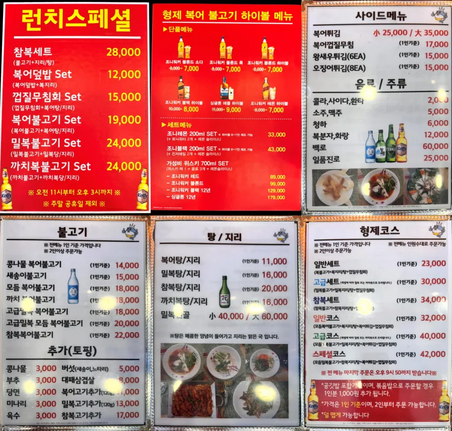 형제복어불고기는 점심특선, 코스요리, 단품 메뉴가 모두 준비되어 있어 선택의 폭이 넓습니다.