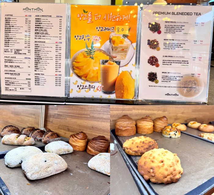몽트몽의 가장 큰 매력 중 하나는 자체 베이커리입니다. 입구 쪽 진열장에는 다양한 빵들이 가지런히 놓여 있어, 마치 유럽식 베이커리 숍에 들어온 듯한 느낌을 줍니다.