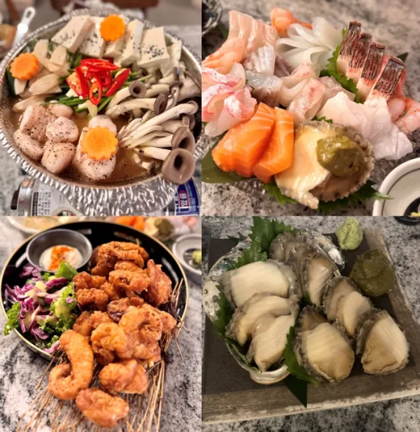 - 숙성 사시미 모리아와세는 연어, 광어, 도미, 새우 등 다양한 생선회를 한 접시에서 즐길 수 있는 메뉴입니다.