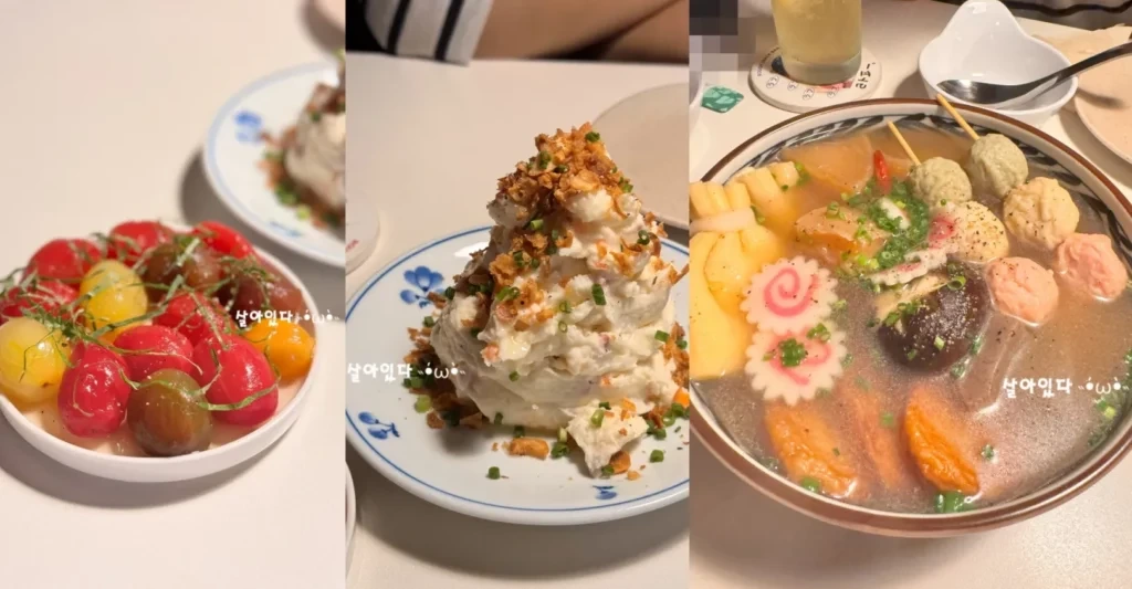 - 토마토 사라다는 달콤하게 절여진 방울토마토로, 상큼함보다 단맛이 강해 디저트처럼 즐길 수 있습니다.