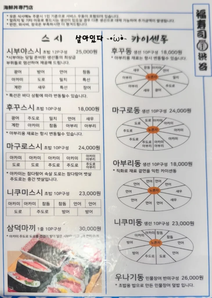 자리에 앉으면 메뉴판이 제공되는데요. 후쿠스시 시부야에서는 초밥과 덮밥 종류만 판매하고 있습니다. 다양한 메뉴를 원하신다면, 본점의 메뉴도 미리 확인해보는 것이 좋습니다.