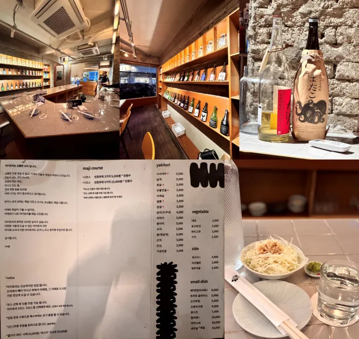 한쪽 벽면에는 다양한 일본 사케 병들이 전시되어 있어, 보는 것만으로도 기대감을 높입니다. 혼밥부터 소규모 모임까지 모두 편안하게 즐길 수 있는 이자카야 분위기입니다.