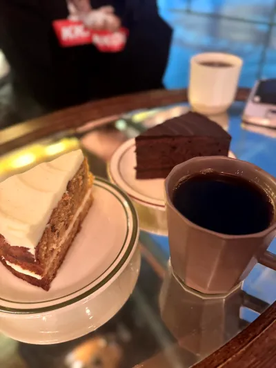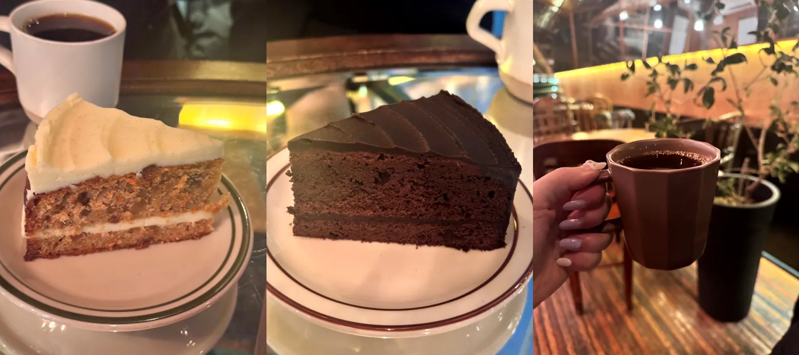 선댄스팜에서 커피만큼 인상 깊었던 건 바로 수제 디저트였습니다. 쇼케이스에 진열된 여러 종류 중, 당근케이크와 다크 초콜릿 케이크를 선택했는데, 둘 다 기대 이상이었습니다.