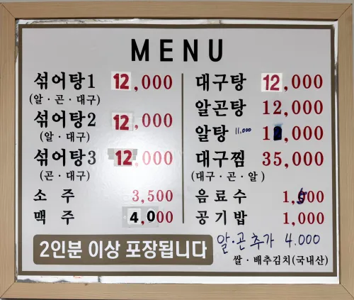- 대표메뉴: 섞어탕, 대구탕, 알곤탕, 대구찜 등