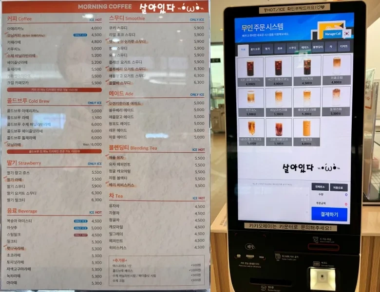 커피는 키오스크를 통해 주문할 수 있으며, 사용이 어려운 분들을 위해 친절한 직원분이 도움을 주십니다. 다양한 커피 메뉴가 있어 선택의 폭이 넓습니다.