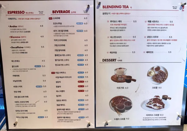 - 디저트 메뉴: 티라미수 크로플, 아포가토, 조각 케이크, 롤케이크 등 다양한 라인이 준비되어 있습니다. 달콤함과 고소함이 적절히 어우러져 커피와 환상의 궁합을 자랑합니다.