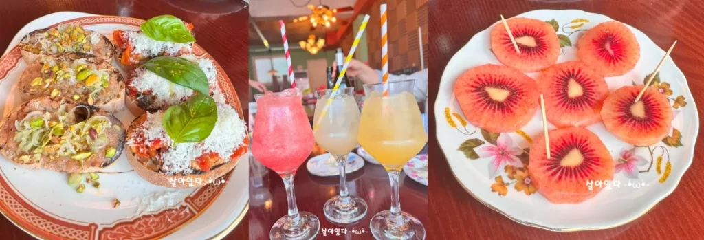 와인과 함께 즐길 메뉴로 프리타타도 추가로 주문했습니다. 명란과 구운 토마토가 올라간 프리타타는 Meroi Chardonnay와 잘 어울렸습니다. 또한, 다양한 종류의 샌펠리그리노도 맛보았는데, 상큼한 과일맛이 강하게 느껴지는 음료였습니다.