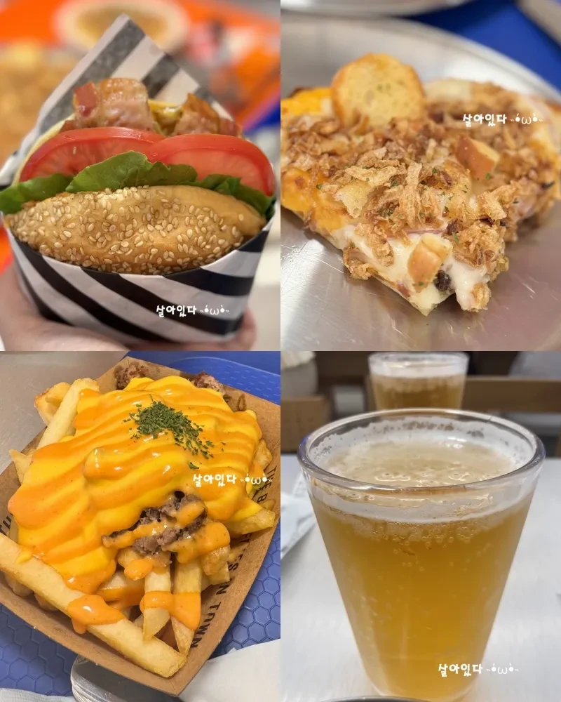 사이드 메뉴로 주문한 치즈버거 프라이즈는 감자튀김 위에 햄버거 패티와 치즈가 듬뿍 올라간 메뉴로, 맥주와 함께 즐기기 딱 좋은 조합이었습니다. 감자튀김만으로도 만족스러운데, 고기의 풍미까지 더해져 식사 후에도 계속 손이 가는 메뉴였습니다.
