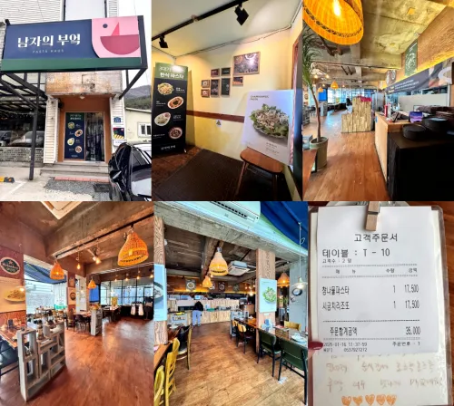 남자의부엌 이탈리아 레스토랑은 깔끔한 화이트 외벽과 귀여운 로고가 눈에 띄는 곳입니다. 입구에는 "3대가 즐기는 한식 파스타"라는 문구가 적힌 메뉴판이 세워져 있어, 들어가기 전부터 기대감을 불러일으킵니다.