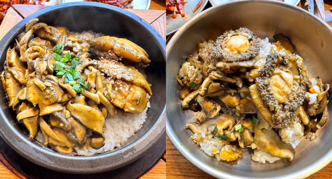 전복명가의 전복솥밥은 말 그대로 ‘전복이 가득’한 보양식입니다. 뚝배기 밥 위에 올려진 전복은 큼직하고, 얇게 썬 표고버섯과 함께 양념 없이도 그 자체로 고소한 향이 퍼졌습니다.
