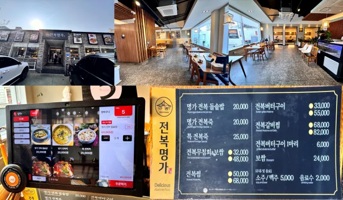 외관은 깔끔하고 모던한 느낌의 벽돌 외장, 입구에는 다양한 전복 요리 사진이 있어 들어가기 전부터 기대감을 높여줍니다. 내부는 넓고 고급스러우며, 룸 형태 좌석도 있어 가족 외식이나 회식 자리로도 손색없습니다.