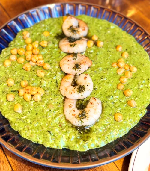 - 비주얼 : 초록빛 시금치 크림 소스 위에 새우와 병아리콩이 고르게 올려져 독특한 색감이 매력적입니다.