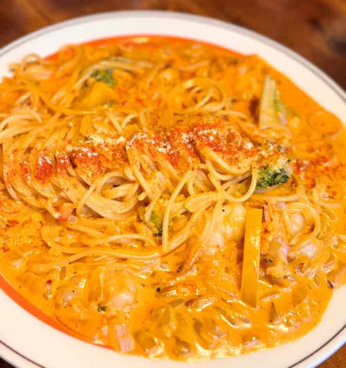 - 비주얼 : 붉은빛 로제 소스 위에 파스타가 듬뿍 담겨 있고, 큼직한 새우가 푸짐하게 올려져 있습니다.