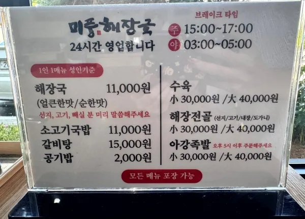 - 주요메뉴 : 해장국, 소고기국밥, 갈비탕, 해장전골, 수육 등
