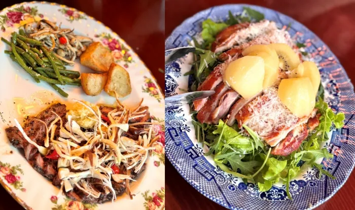 메인 요리: 부채살 스테이크와 치킨 스테이크 샐러드